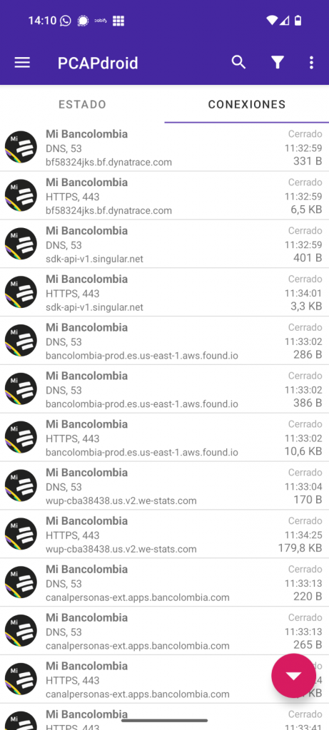 Entonces fuimos despacio y miramos, de manera pasiva y con una metodología no intrusiva, el tráfico de red generado por la aplicación. Es decir, analizamos a dónde se van los datos que envía la aplicación y de donde provienen los que recibe. Nada más. Ningún servicio fue hackeado en este análisis. Encendimos la aplicación Bancolombia, hicimos un pago hacia una cuenta Nequi y miramos con quién hablaba la app de Bancolombia. Repetimos la experiencia.Lo hicimos usando una aplicación relativamente fácil de usar y de código abierto que se llama PCAPDroid, sin intentar descifrar el tráfico, sólo mirando desde el exterior a donde se conectaba la aplicación. El resultado nos dió algo así (aquí aparece sólo una pequeña parte del tráfico):