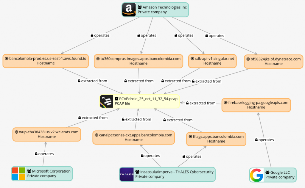 El gráfico muestra las URL a las cuáles se conecta la aplicación Bancolombia e identifica las empresas que alojan los servidores correspondientes. Esta información es extraída del archivo de captura de tráfico generado por el programa PCAPDroid. Efectivamente se puede observar que: