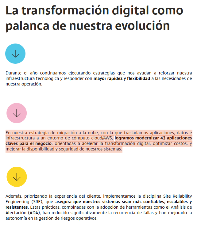 Para volver a Bancolombia, en su informe de gestión 2024, la empresa justifica la migración de 43 de sus aplicaciones a la nube de Amazon (AWS) para “acelerar la transformación digital, optimizar costos, y mejorar la disponibilidad y seguridad de nuestros sistemas”: